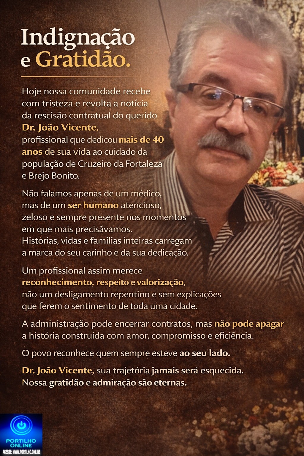 É com profunda indignação que a população de Cruzeiro da Fortaleza e Brejo Bonito recebe a notícia da rescisão contratual do querido Dr. João Vicente.