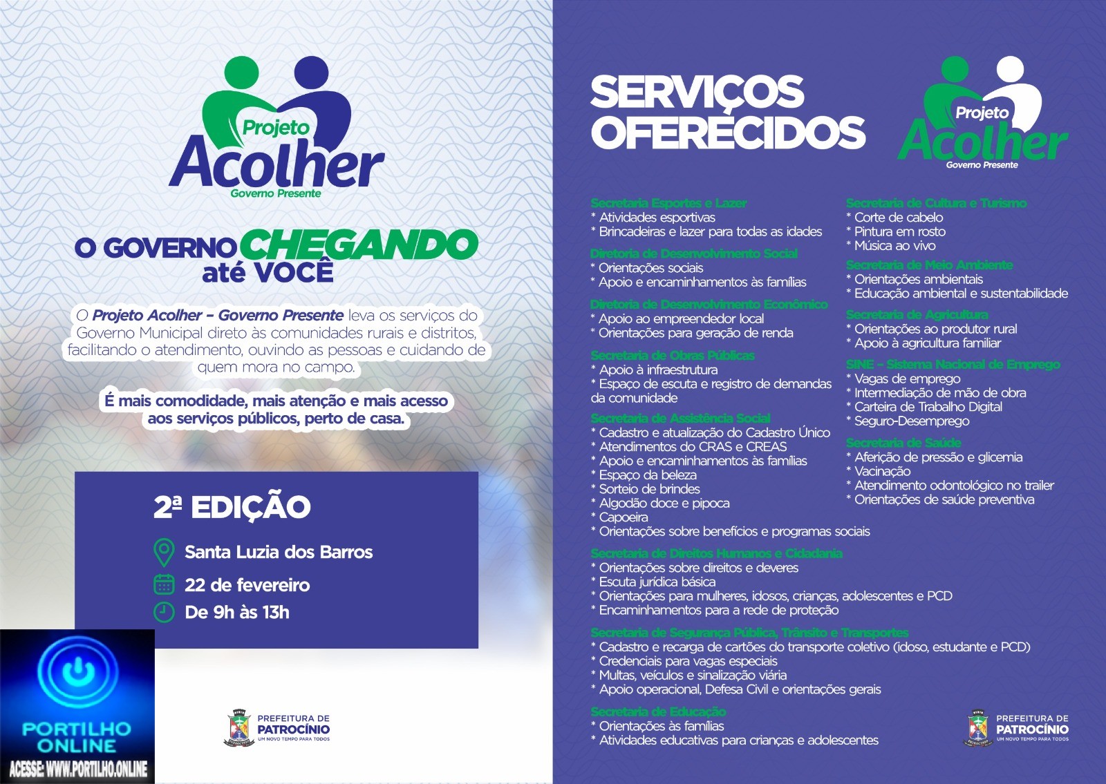 O Governo Municipal realiza, no dia 22 de fevereiro, das 9h às 13h, em Santa Luzia dos Barros, a 2ª edição do Projeto Acolher – Governo Presente, iniciativa que leva serviços públicos diretamente às comunidades rurais e distritos, com foco em facilitar o acesso, ouvir a população e atender demandas locais.