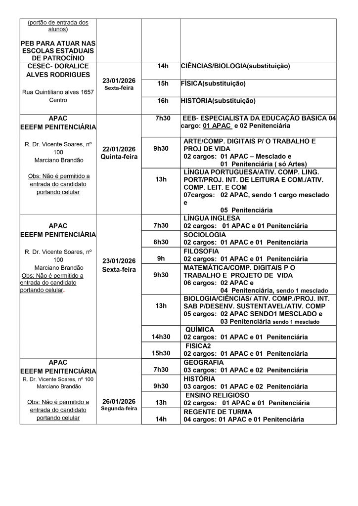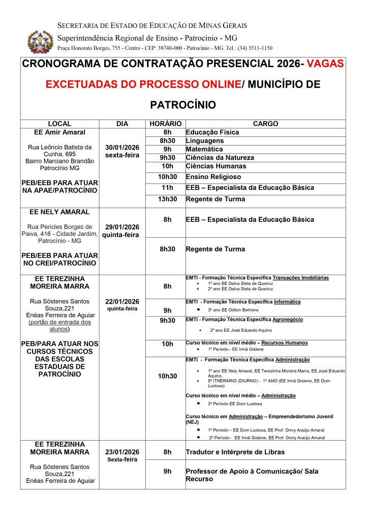 👉🤙🙌👍👏✍👁SUPERINTENDENCIA DE ENSINO DE PATROCINIO INFORMA…Cronograma de Contratação Presencial 2026 – Patrocínio Data: janeiro 23, 2026 em: Divulgação social., EM DESTAQUE, Locais Cidade, Regionais Cronograma de Contratação Presencial 2026 – Patrocínio *Atualizado em 26/01/2026 Compartilhe Essa Notícia Com Seus Contatos, Escolha a Opção Abaixo: