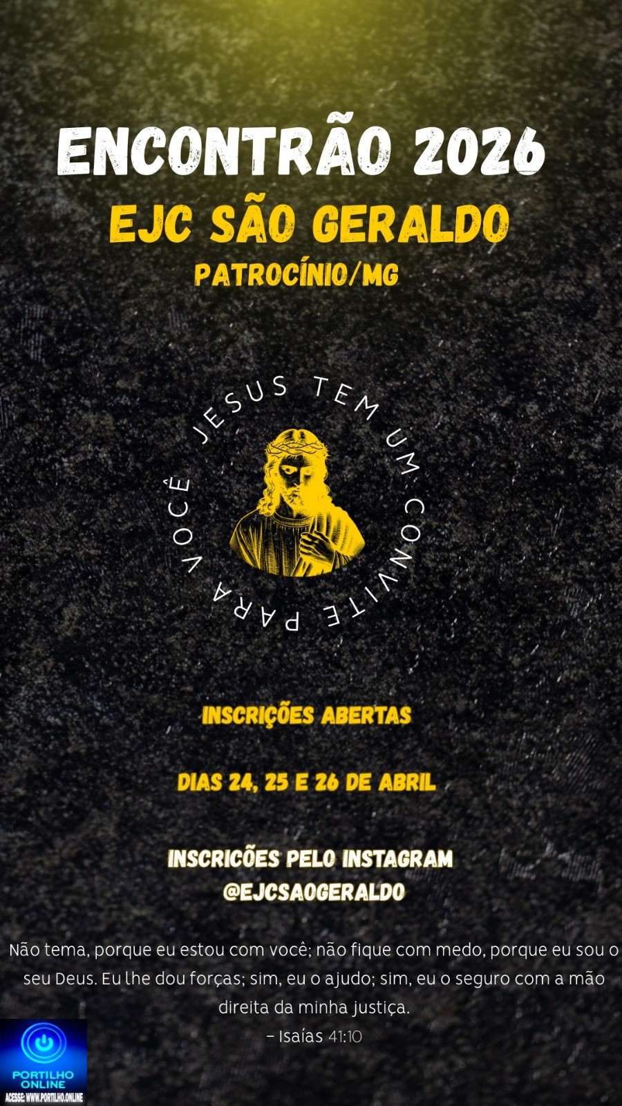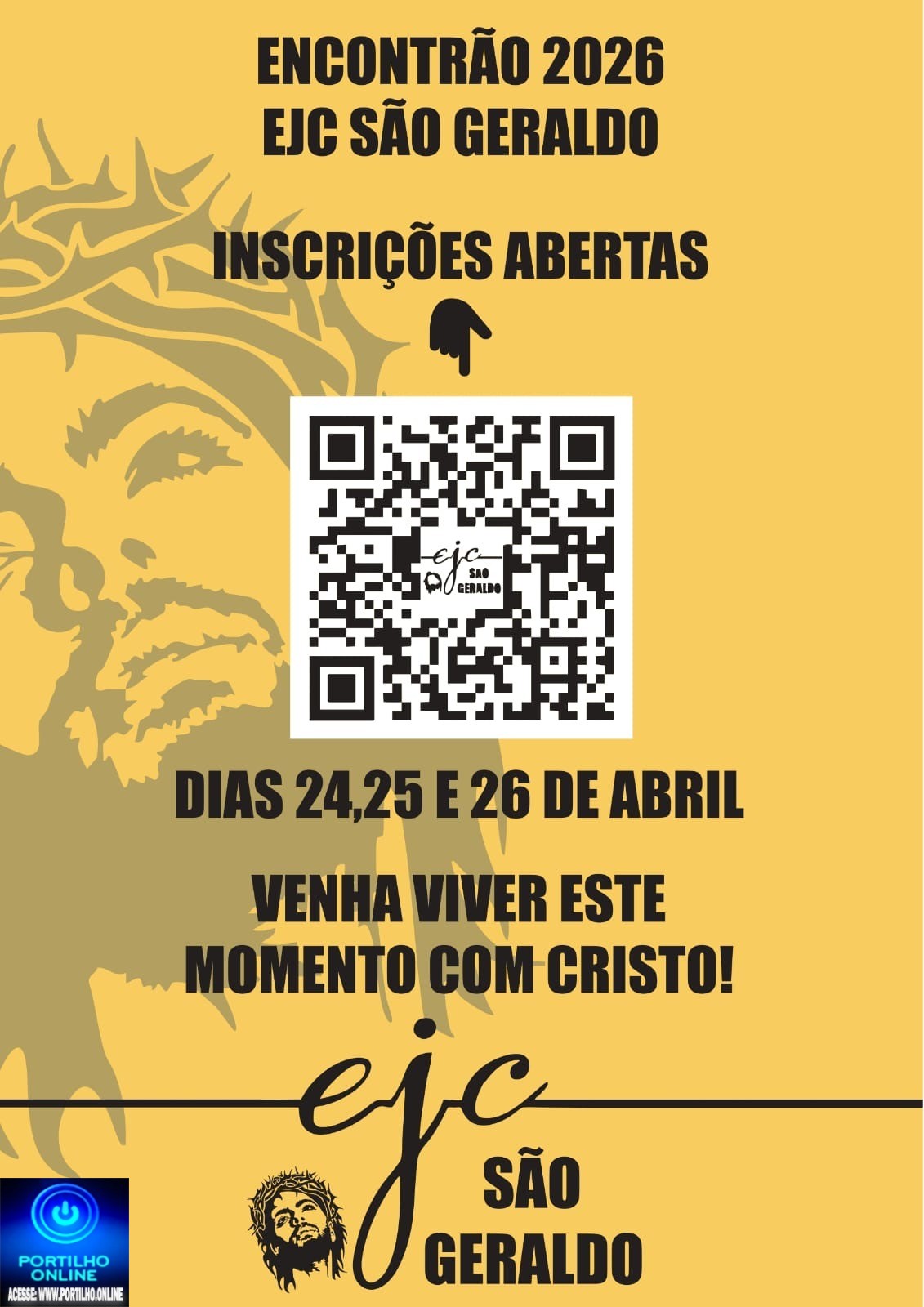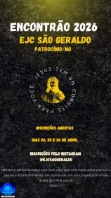 Temos o prazer de convidar jovens maiores de 17 anos para estar tendo um encontro pessoal com Cristo nos dias 24, 25 e 26 de abril de 2026. As inscrições ocorrem por meio do link https://forms.gle/B2GPEqpgj9kRZB8i8 , via instagram na DM do @ejcsaogeraldo