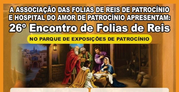 A Prefeitura de Patrocínio apoia e valoriza as manifestações culturais e religiosas que preservam a identidade e as tradições do nosso município. Nesse contexto, a Associação das Folias de Reis de Patrocínio, em parceria com o Hospital do Amor de Patrocínio, realiza o 26º Encontro de Folias de Reis, no Parque de Exposições de Patrocínio, reunindo fé, cultura popular e solidariedade.