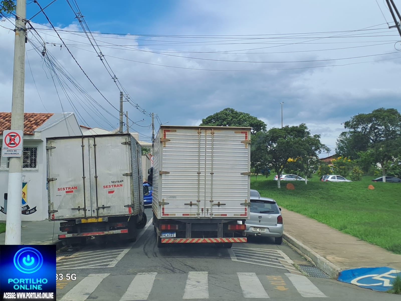 Nota se, que na frente do caminhão da SESTRAN, tem uma viatura do orgão parada em local proibido, contrariando as leis de trânsito.
